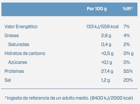 Cada lata contiene 100 gramos de la mejor pechuga de pavo, que nos aporta más de 27,4 gramos de proteína, con solo 2,6 gramos de grasa y menos de un gramo de carbohidratos, lo que nos ayudará a llevar a cabo una dieta equilibrada y totalmente controlada.