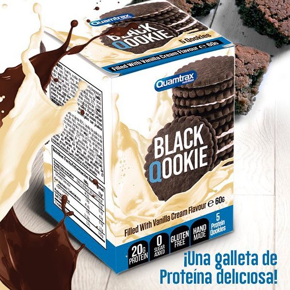 Quamtrax Nutrition se complace de presentar las nuevas galletas Black Qookie con 15 gramos de auténtica proteína por cada caja de 60 gramos. Estas deliciosas galletas negras, no tienen rellenos proteicos de difícil absorción. Son el producto ideal para los que buscan un alimento sano y nutritivo, pero con una suave textura, un delicioso sabor y un magnífico perfil nutricional.