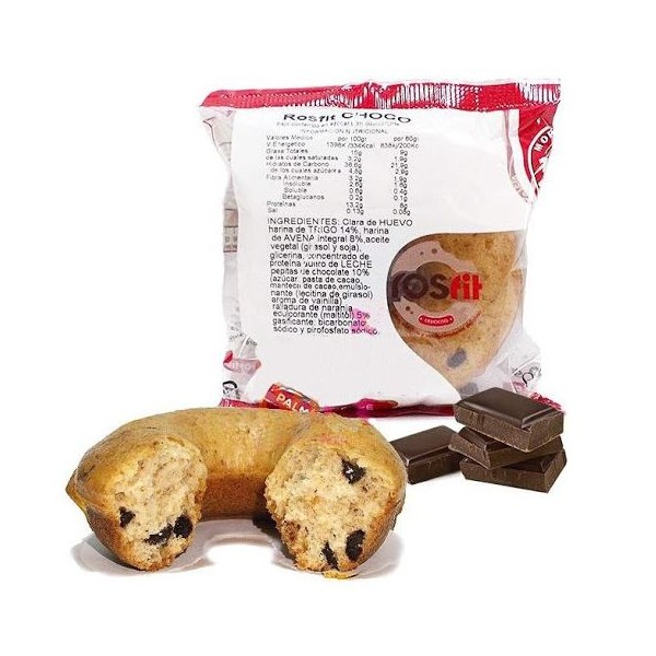 Clara de huevo, harinas de trigo (14%) y avena integral (8%), aceite vegetal (girasol y soja) glicerina, concentrado de proteína de suero de leche, pepitas de chocolate 10% (azúcar, pasta de cacao, manteca de cacao, emulsionante (lecitina de girasol), aroma de vainilla), ralladura de naranja, edulcorante (5%): maltitol, gasificantes (bicarbonato sódico y pirofosfato sódico).